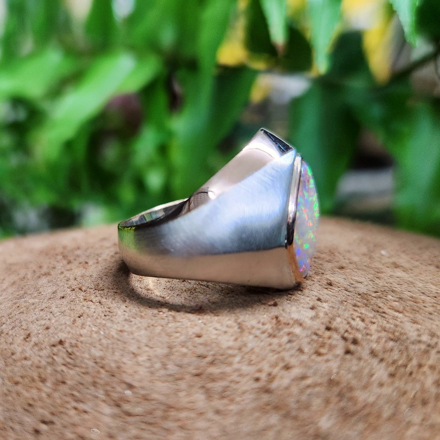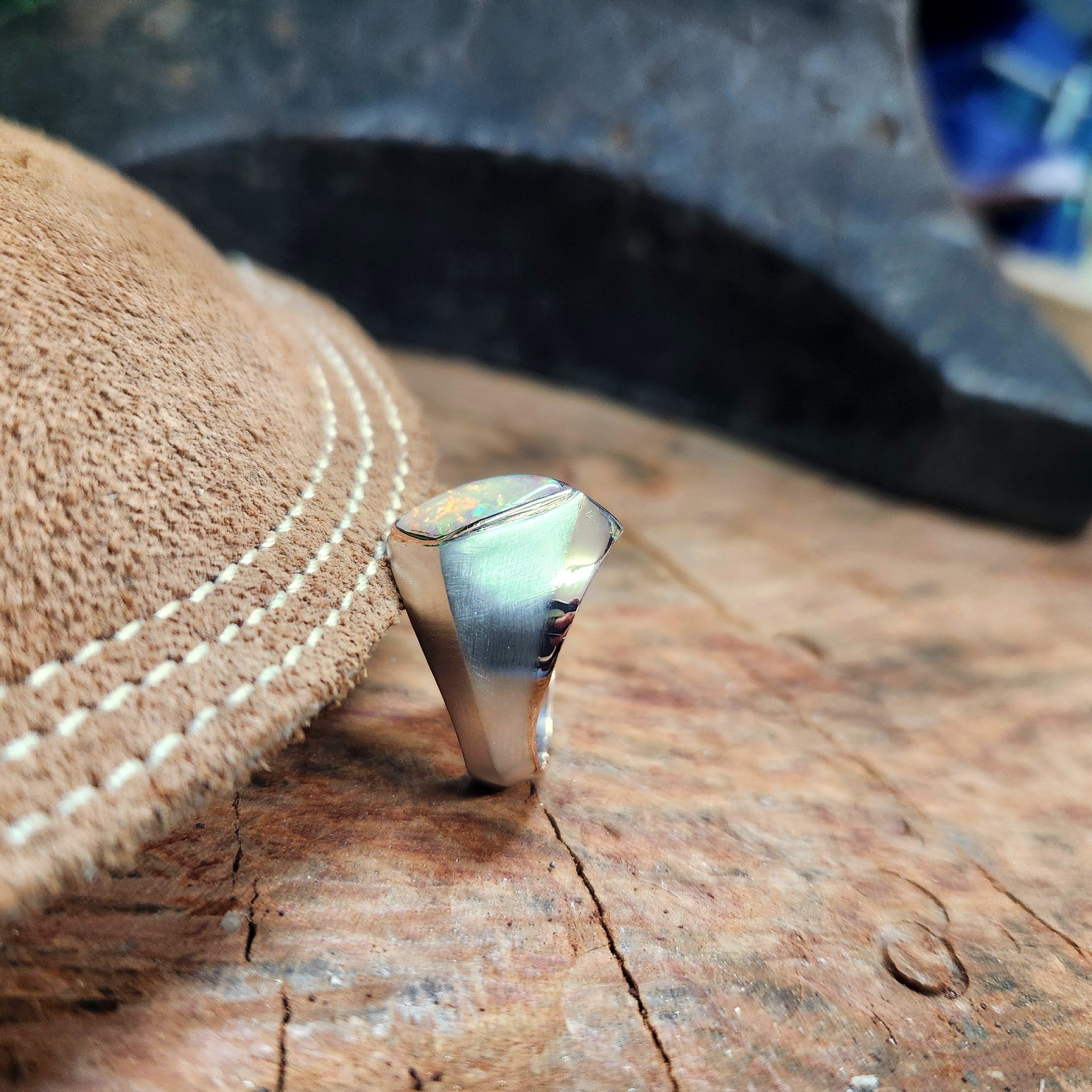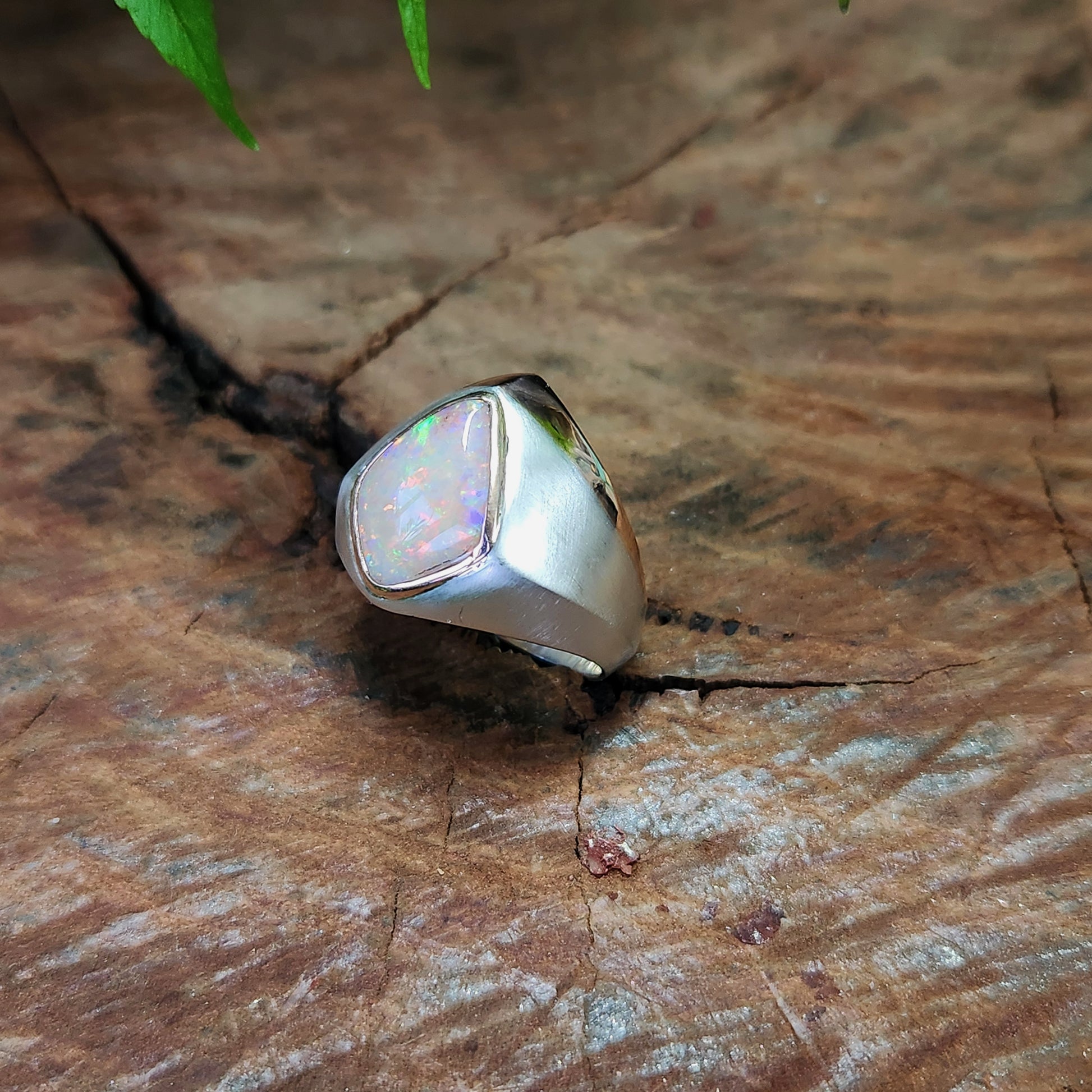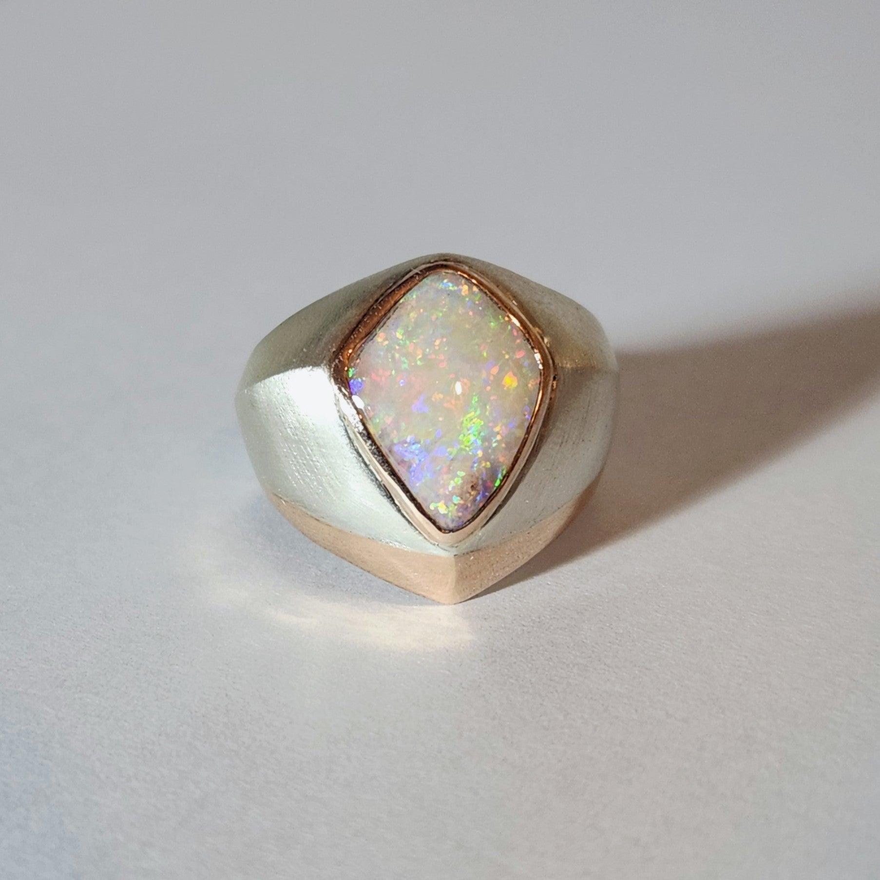 Conveying strength through form, and an appreciation of the beautiful bounty of minerals that our landscape offers, the Armoured ring features a stunning 3.25ct Freeform Winton Pipe Opal. A soft, matte Silver, is contrasted against the highly polished Rose Gold, in a bold, simple form that allows the Opal to capture the viewer's attention.