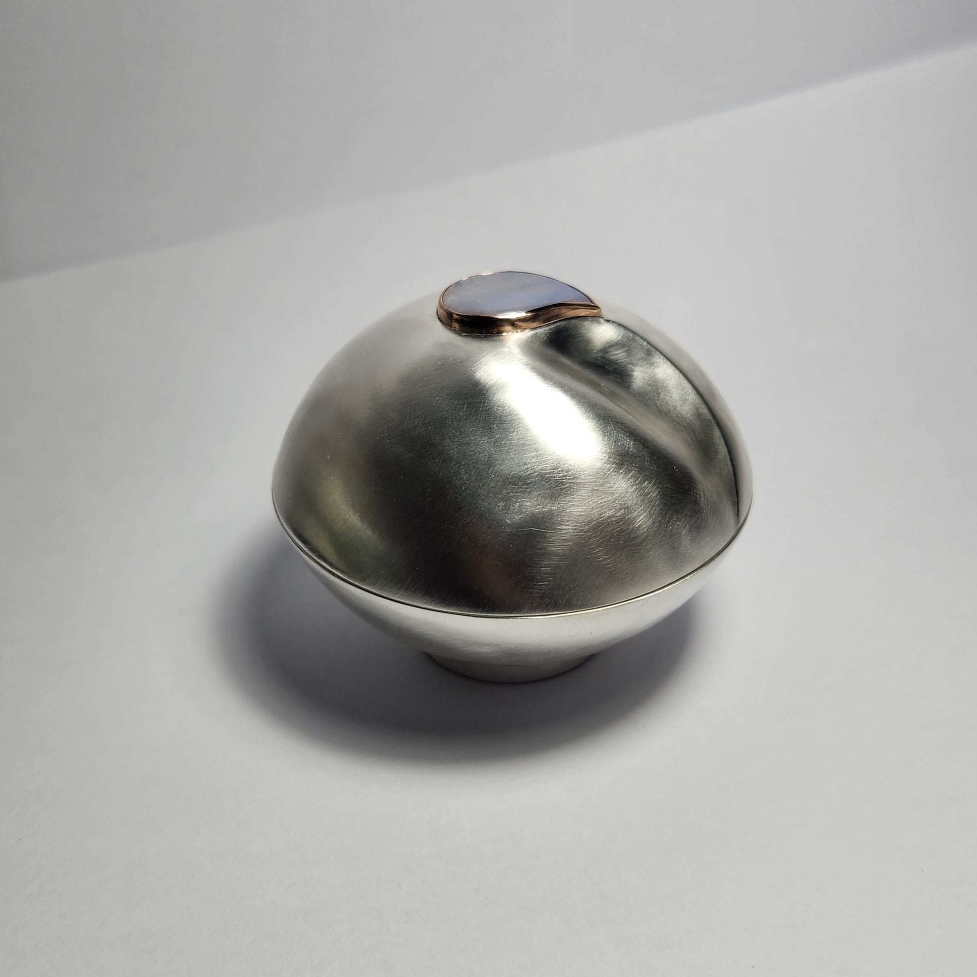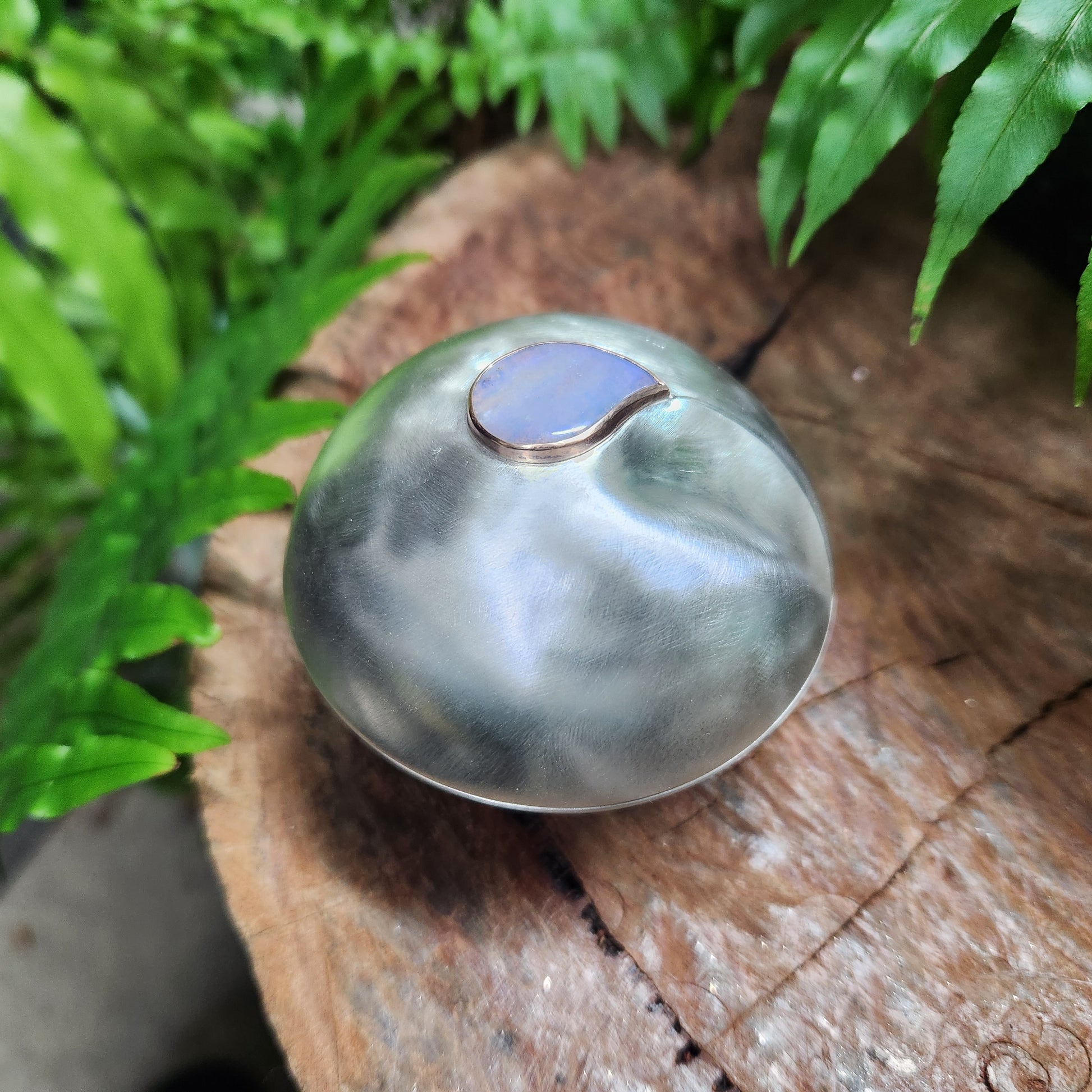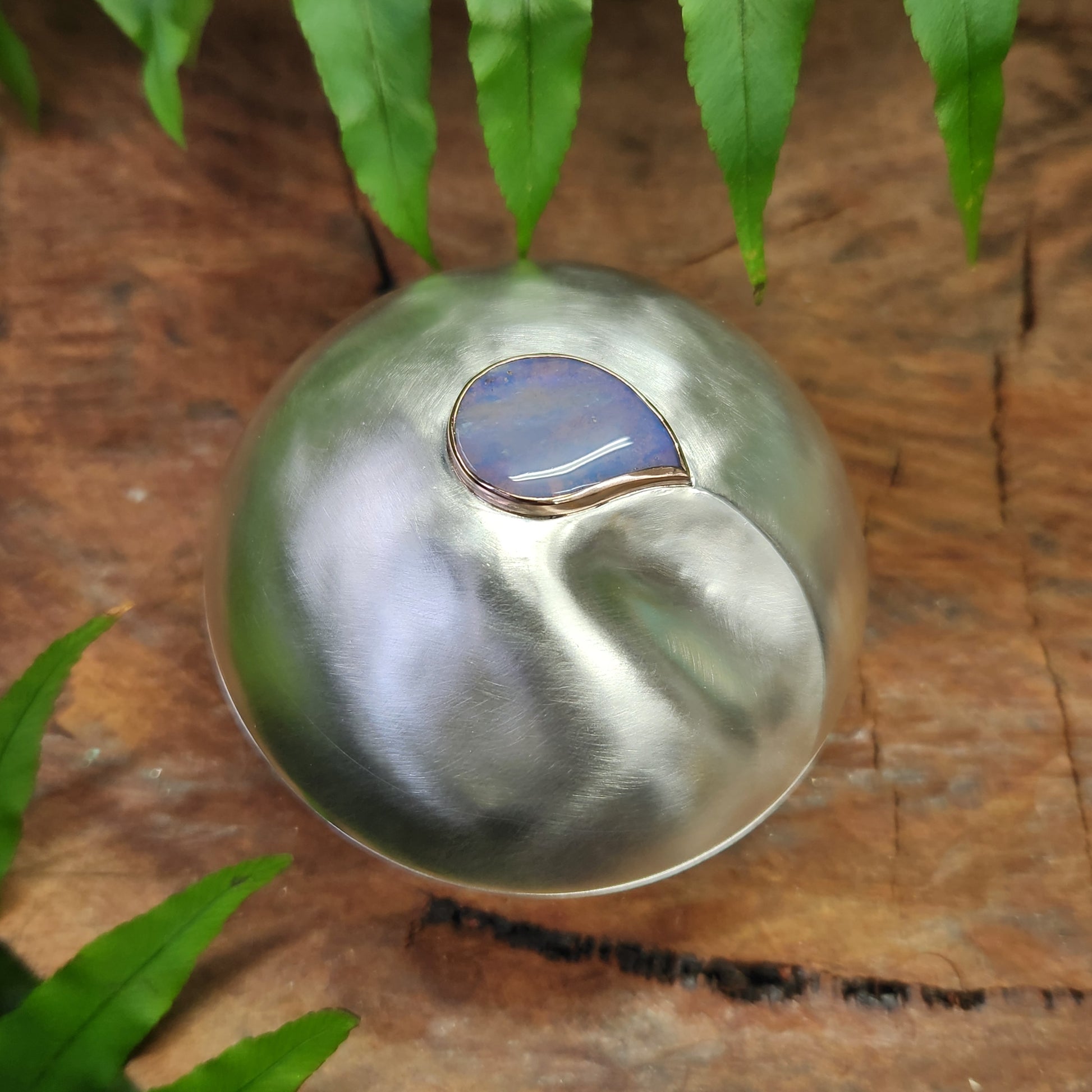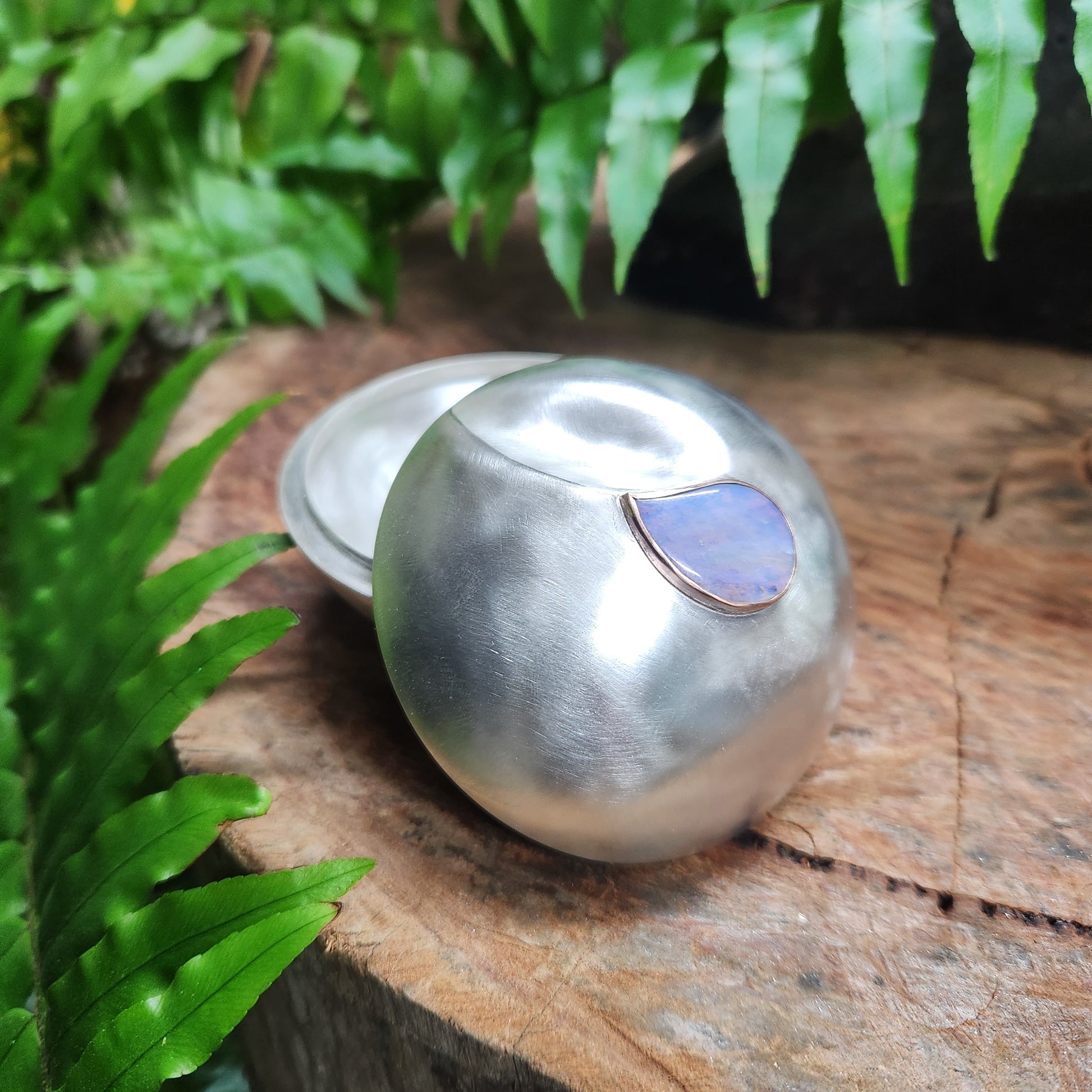 Satin finished Fine Silver box, featuring a pastel purple 10.45ct Winton Boulder Opal set in a highly polished 9ct Rose Gold bezel on the lid. Hand fabricated through techniques such as dapping, chasing and repousse.