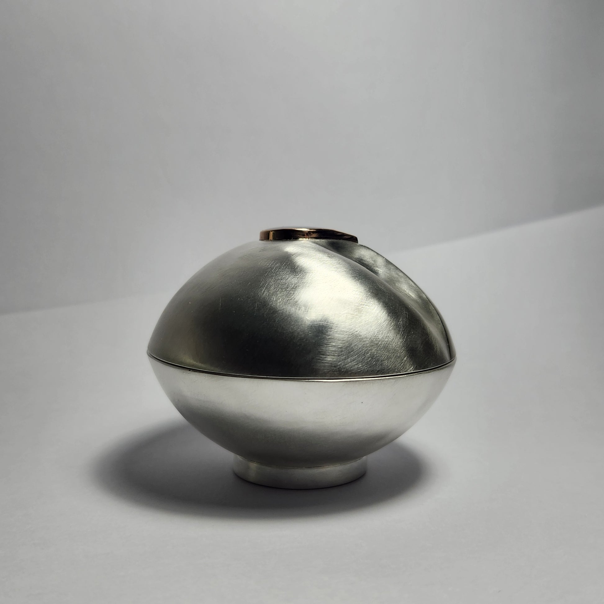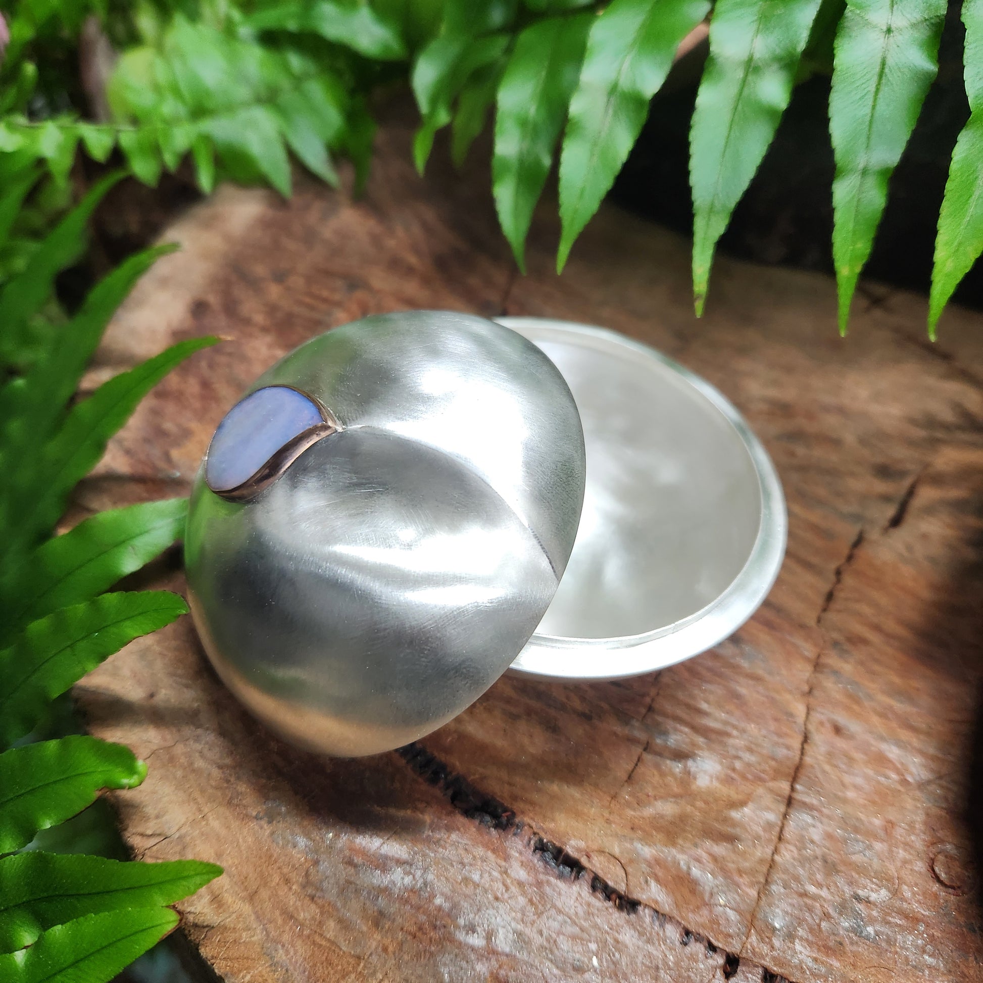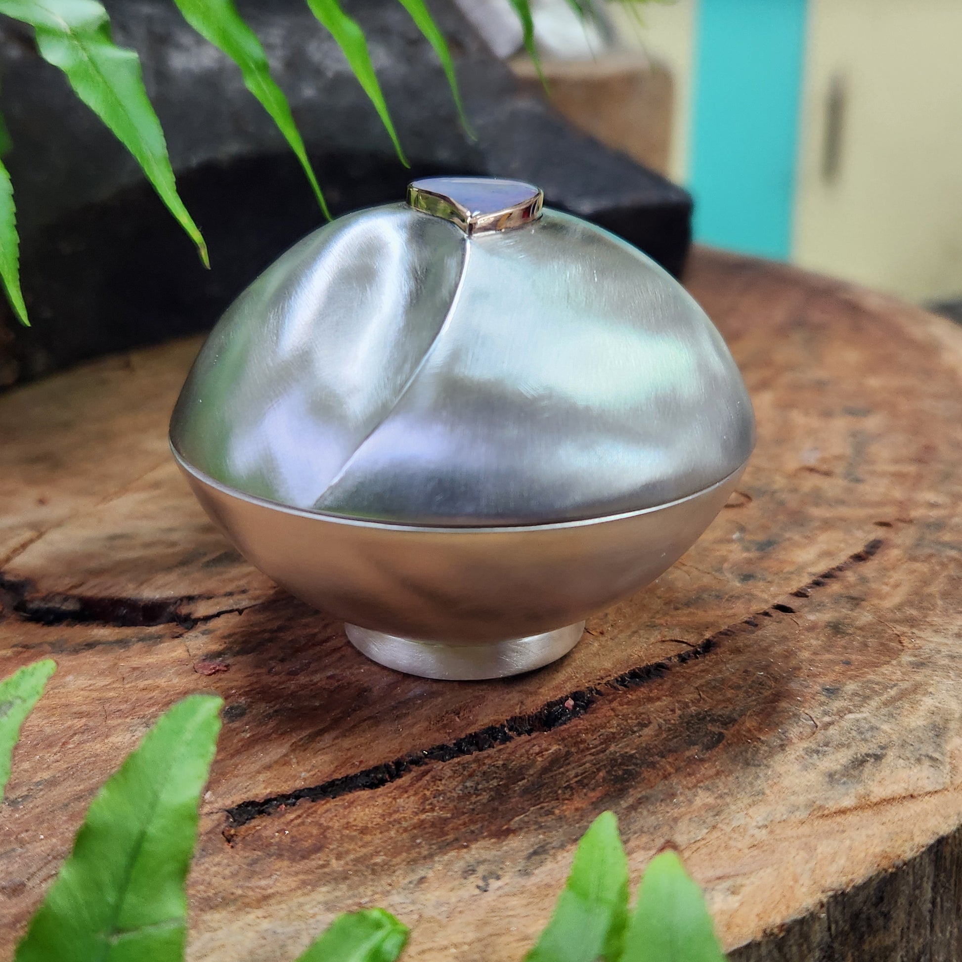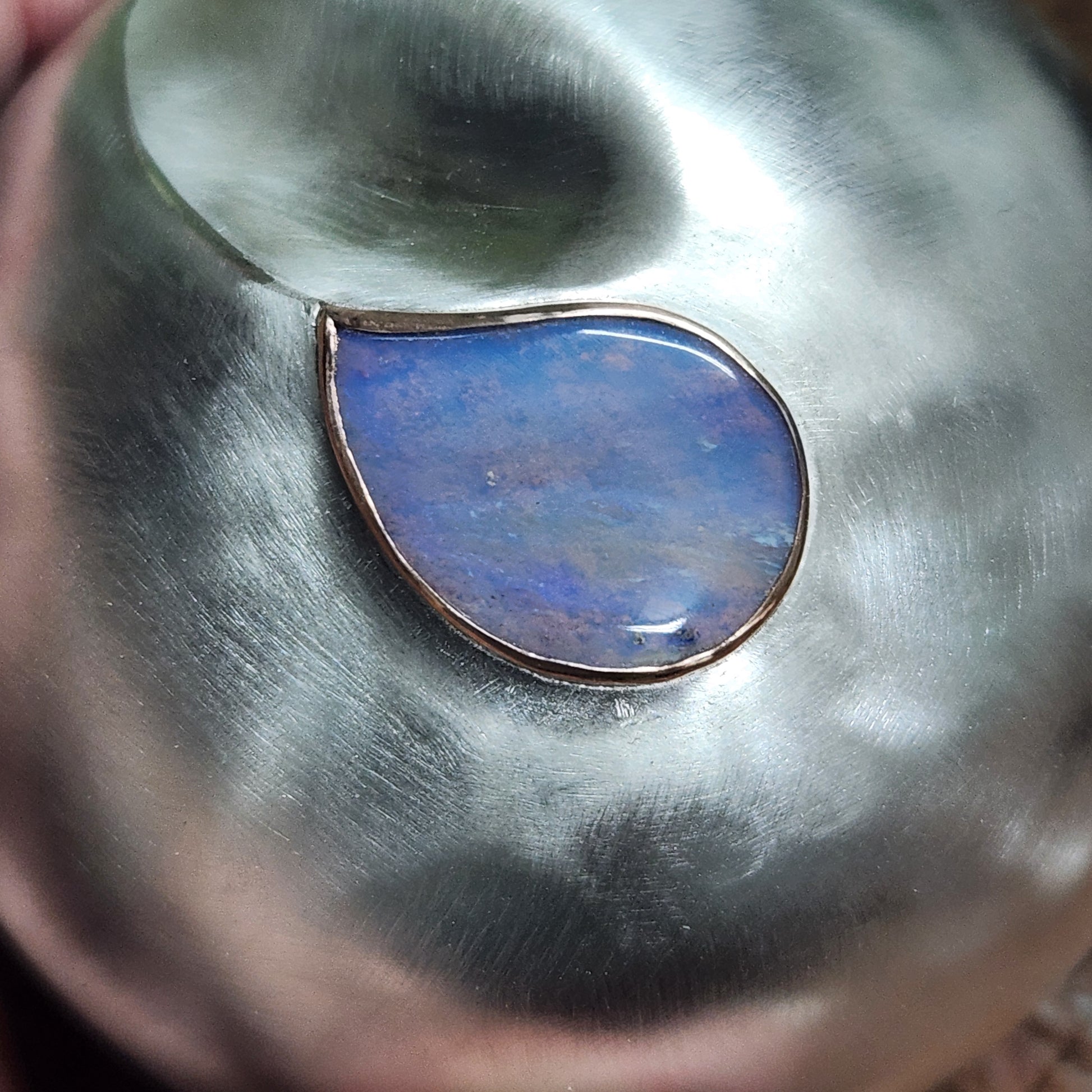 Satin finished Fine Silver box, featuring a pastel purple 10.45ct Winton Boulder Opal set in a highly polished 9ct Rose Gold bezel on the lid. Hand fabricated through techniques such as dapping, chasing and repousse.