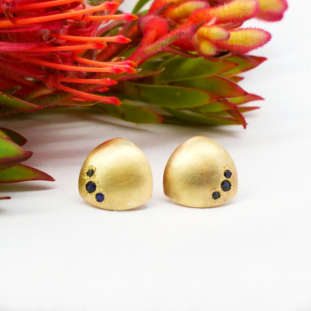 IOTA RAY studs feature three gemstones on each earring, spot set in a matte domed trilliant profile stud with a contrasting high polished edge.