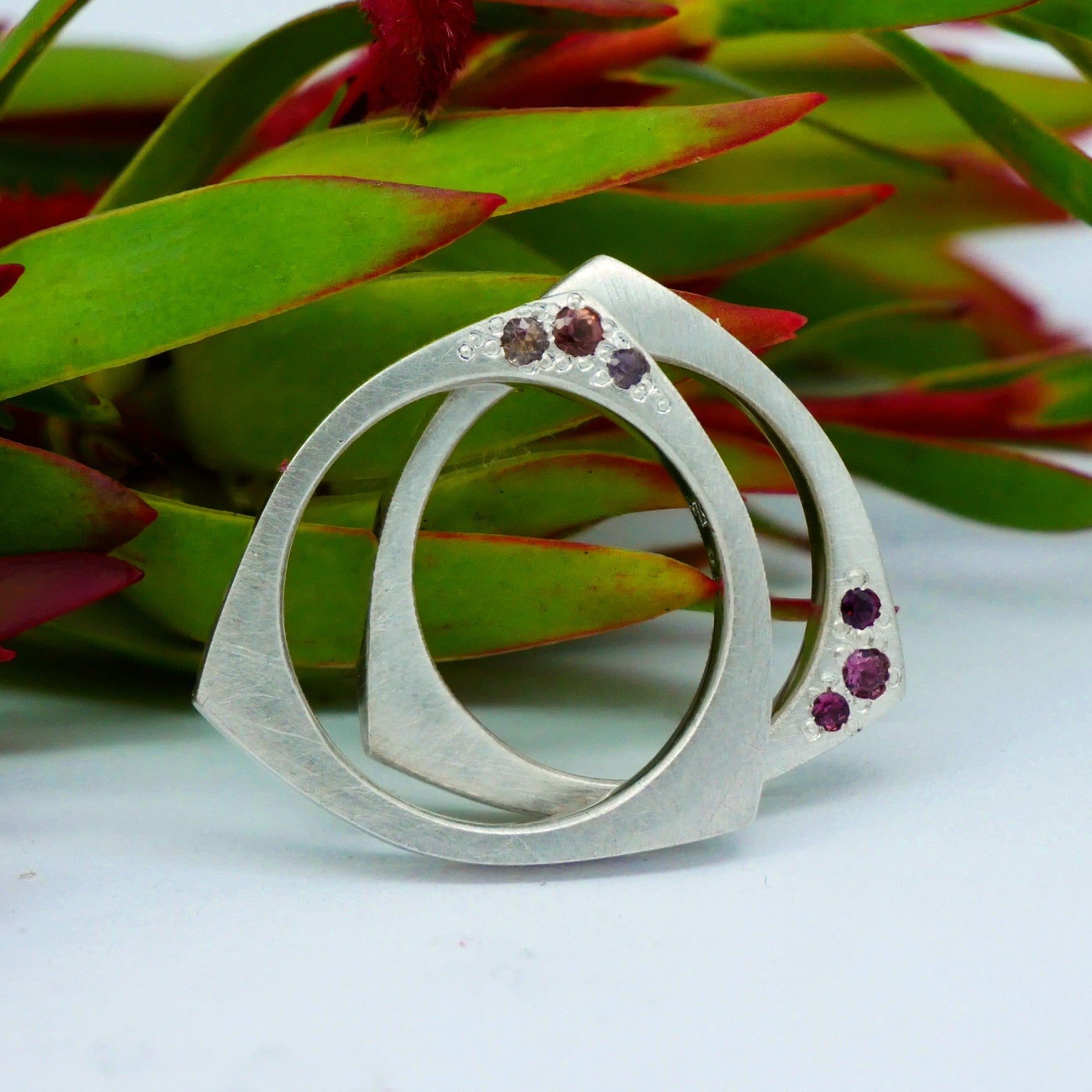 IOTA ring features three small gemstone, spot set in a matte trilliant profile ring band, with a contrasting high polished edge.