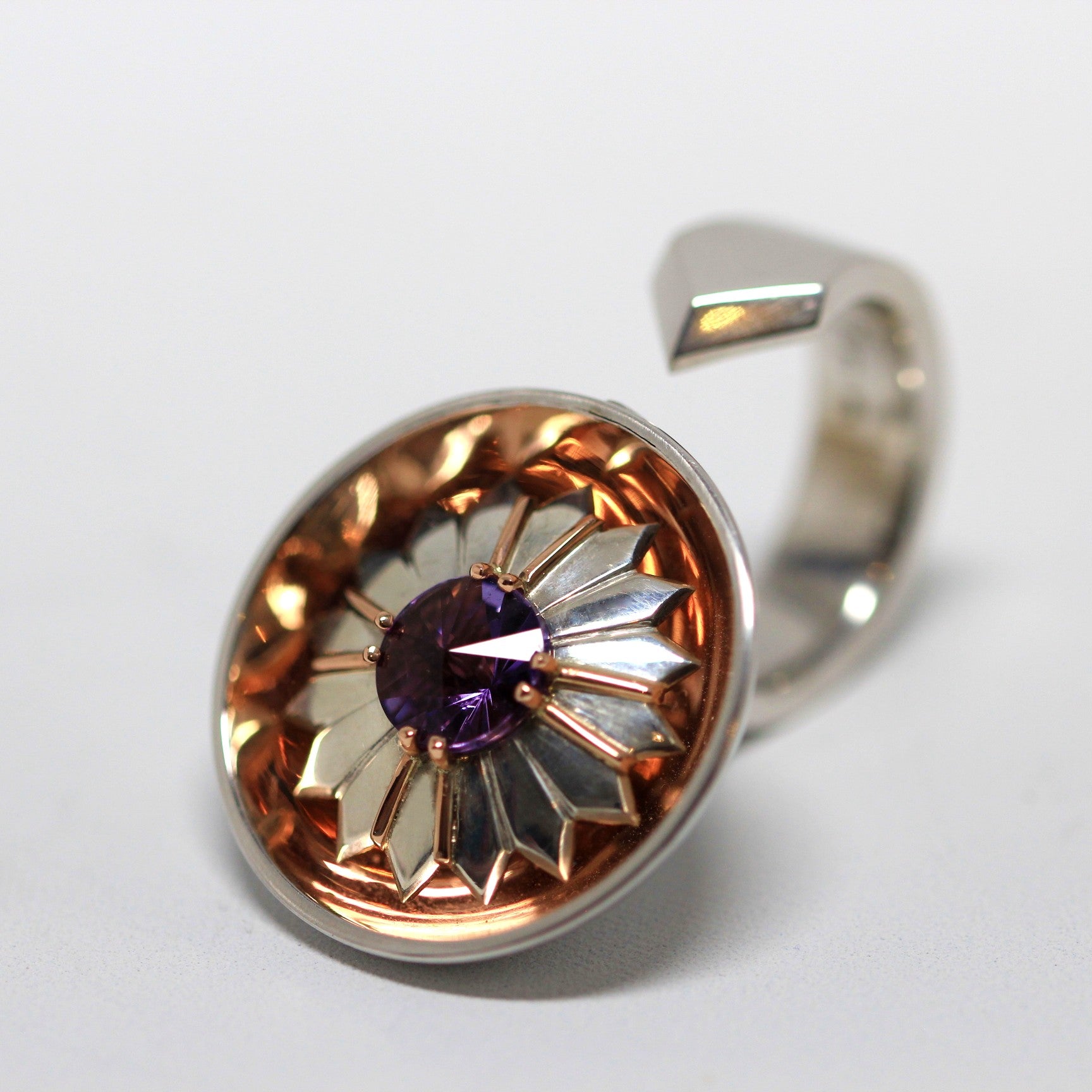 A roseate kaleidoscope dispersing daydreams of colour and facets, this reflection on shared skills centres around a custom faceted Amethyst, hand cut by Myrtle Stoneworks. Extension of the Amethysts facets through a convex Sterling Silver crest, suspended within a Rose Gold bowl, provides a sense of movement and light.
