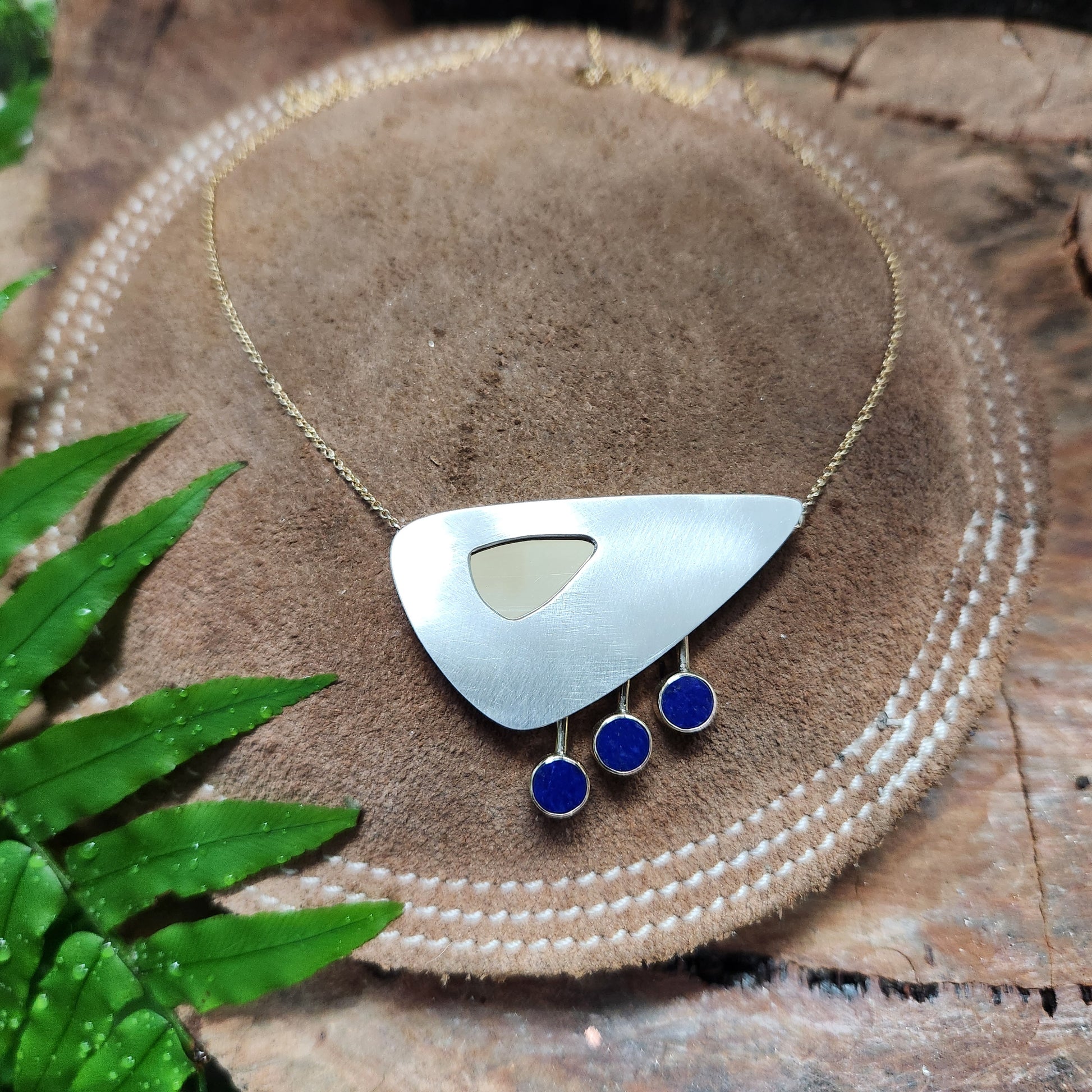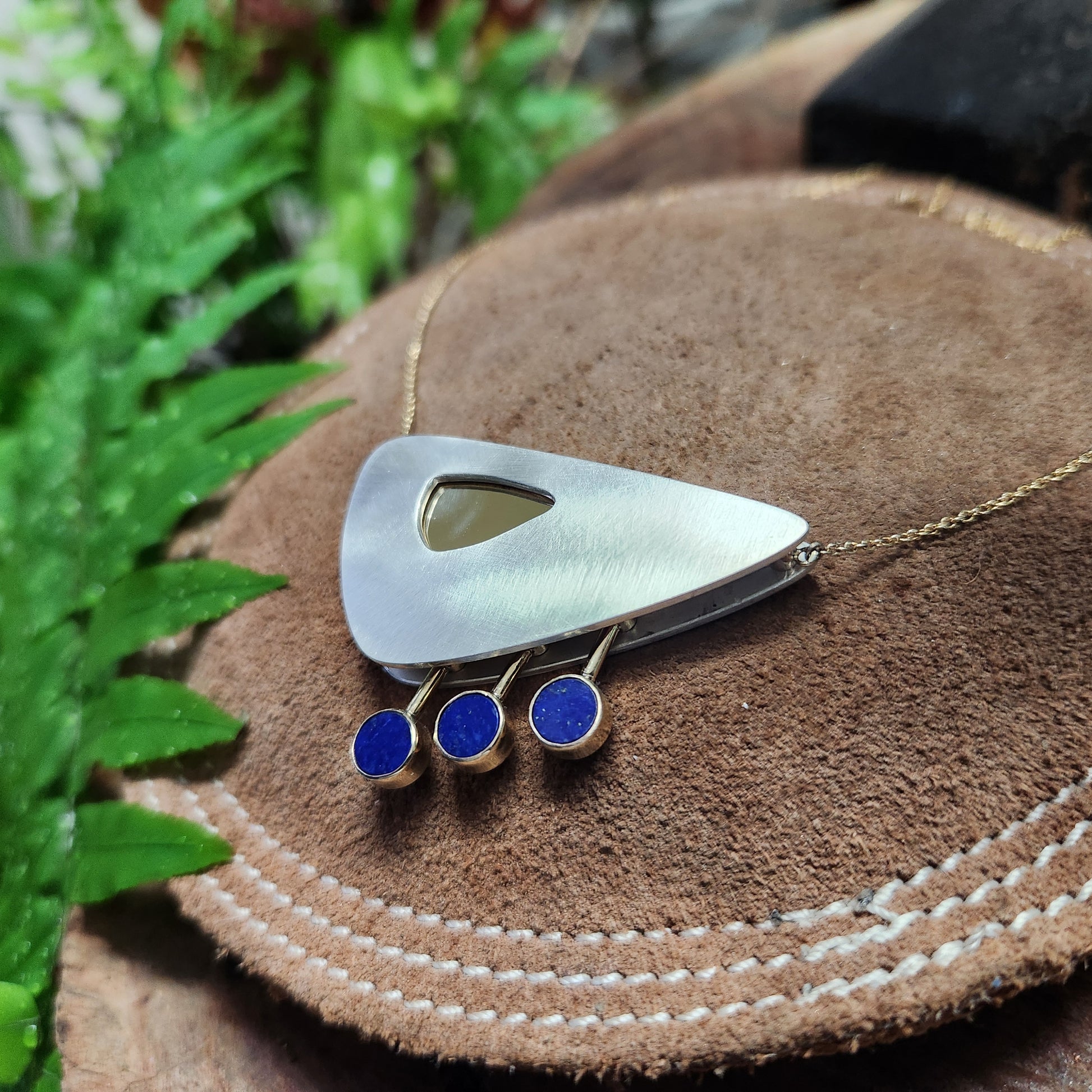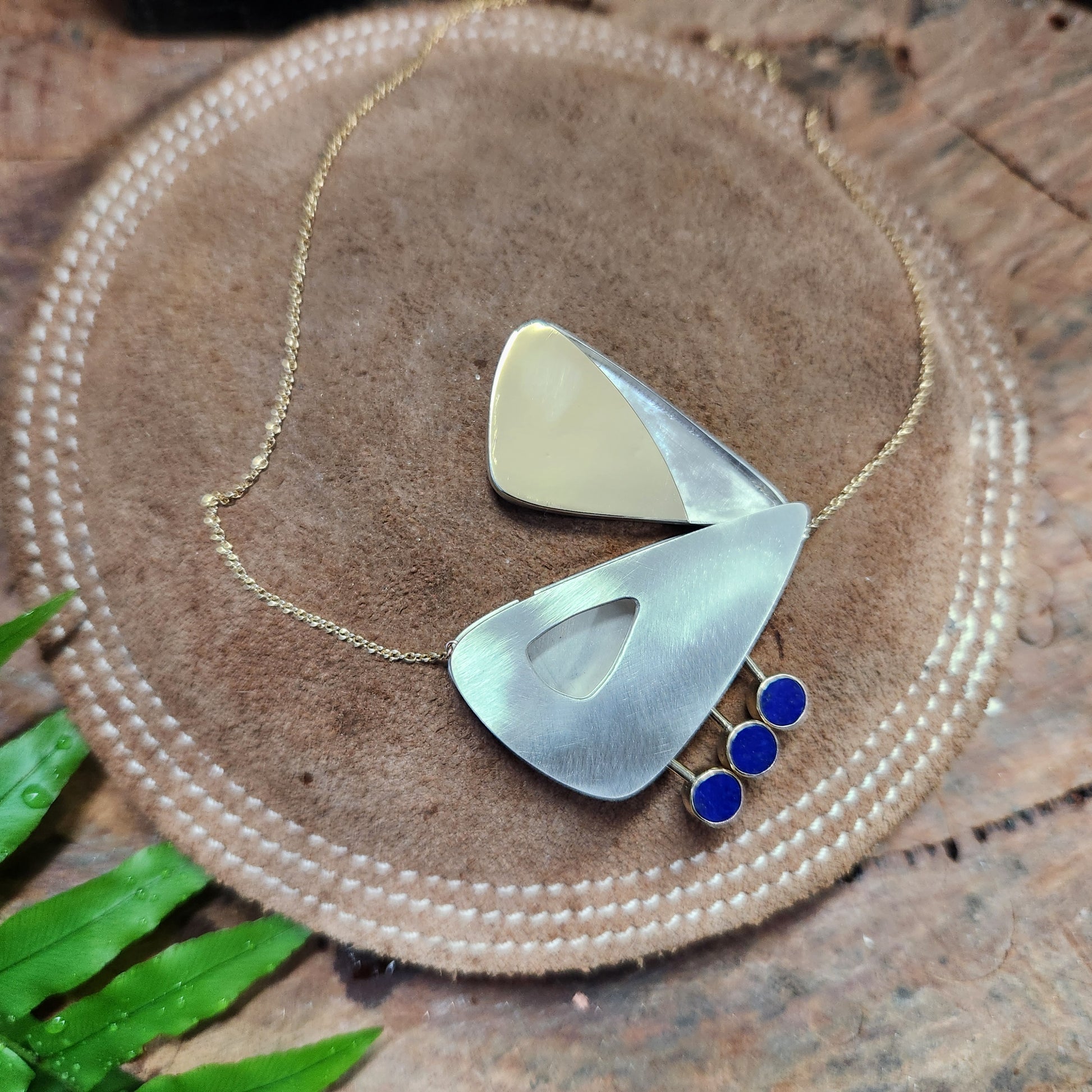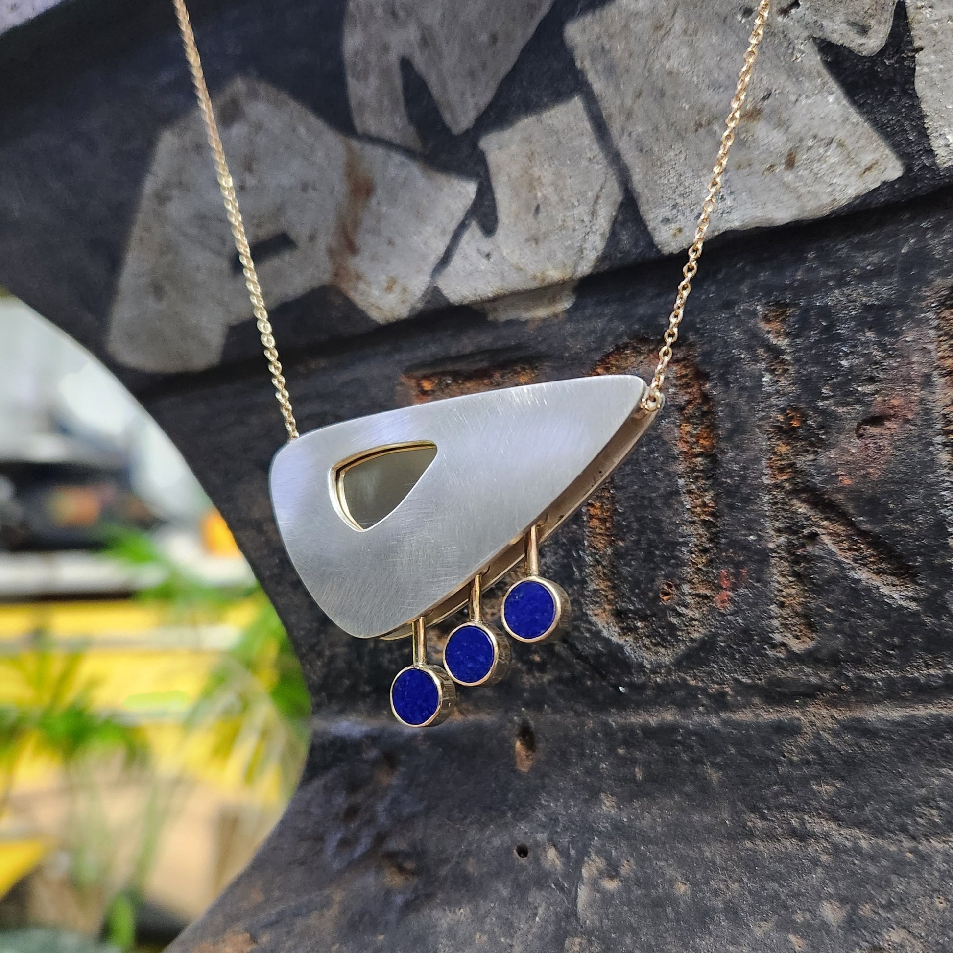The Secrets Locket speaks to the relevance and impact of materials and their makers in a world beyond their initial purpose and practice. Jeweller Erin Pearce utilises a Modernist aesthetic to engineer a Sterling Silver, 9ct Yellow Gold & Lapis Lazuli horizontally hinged locket; a conveyor of the value and power of the female voice.