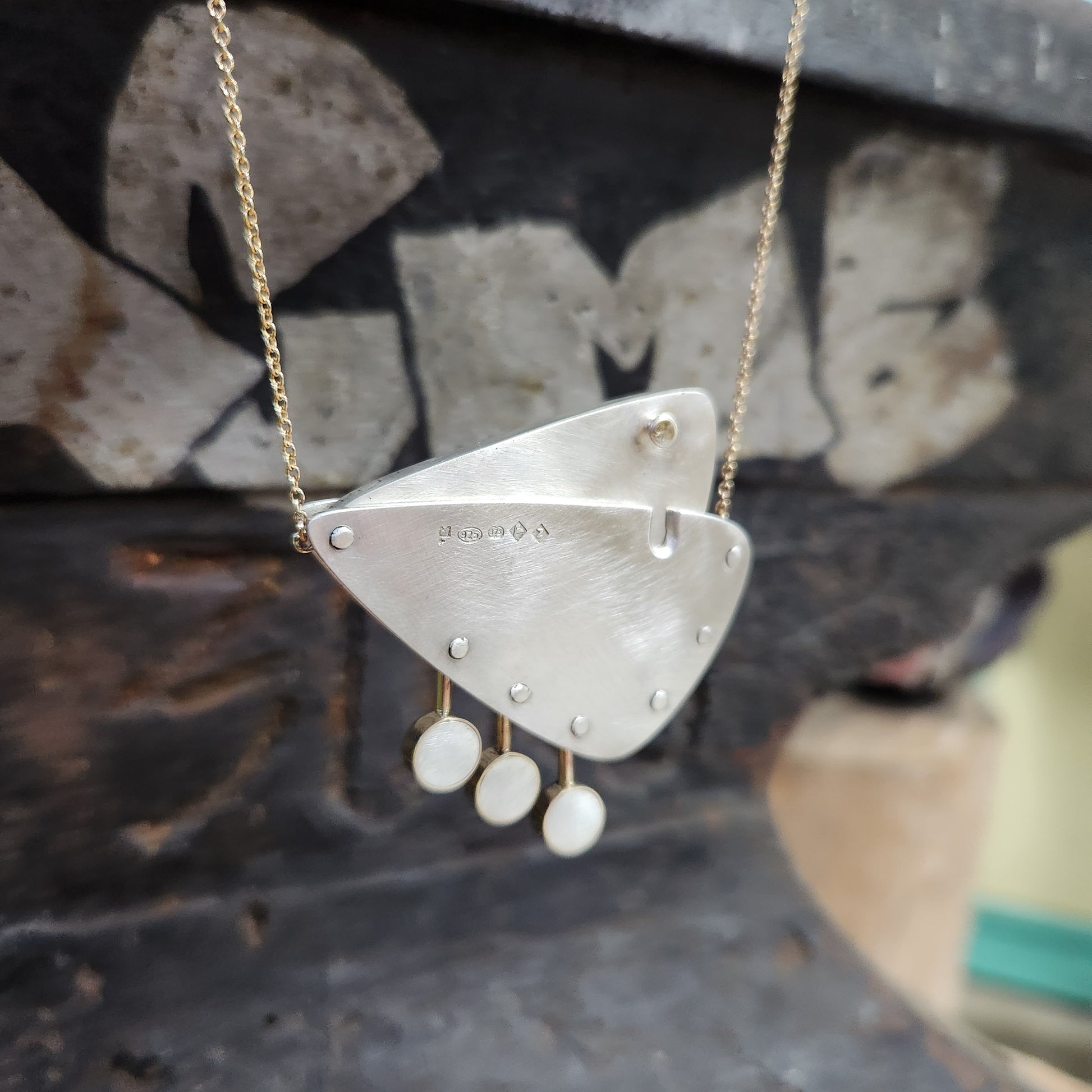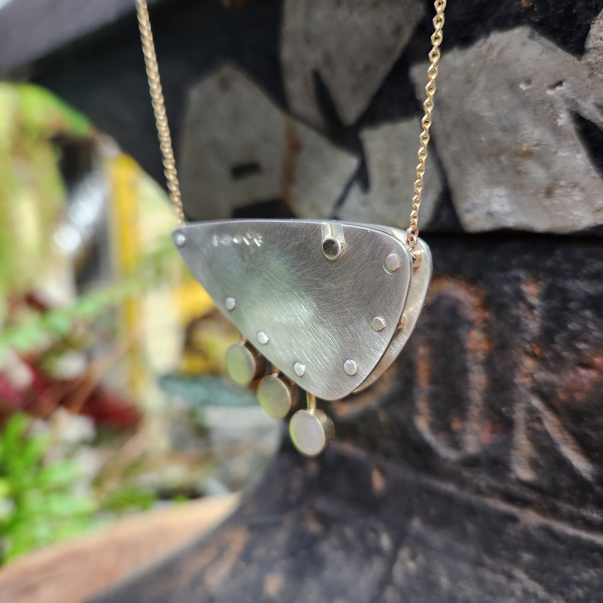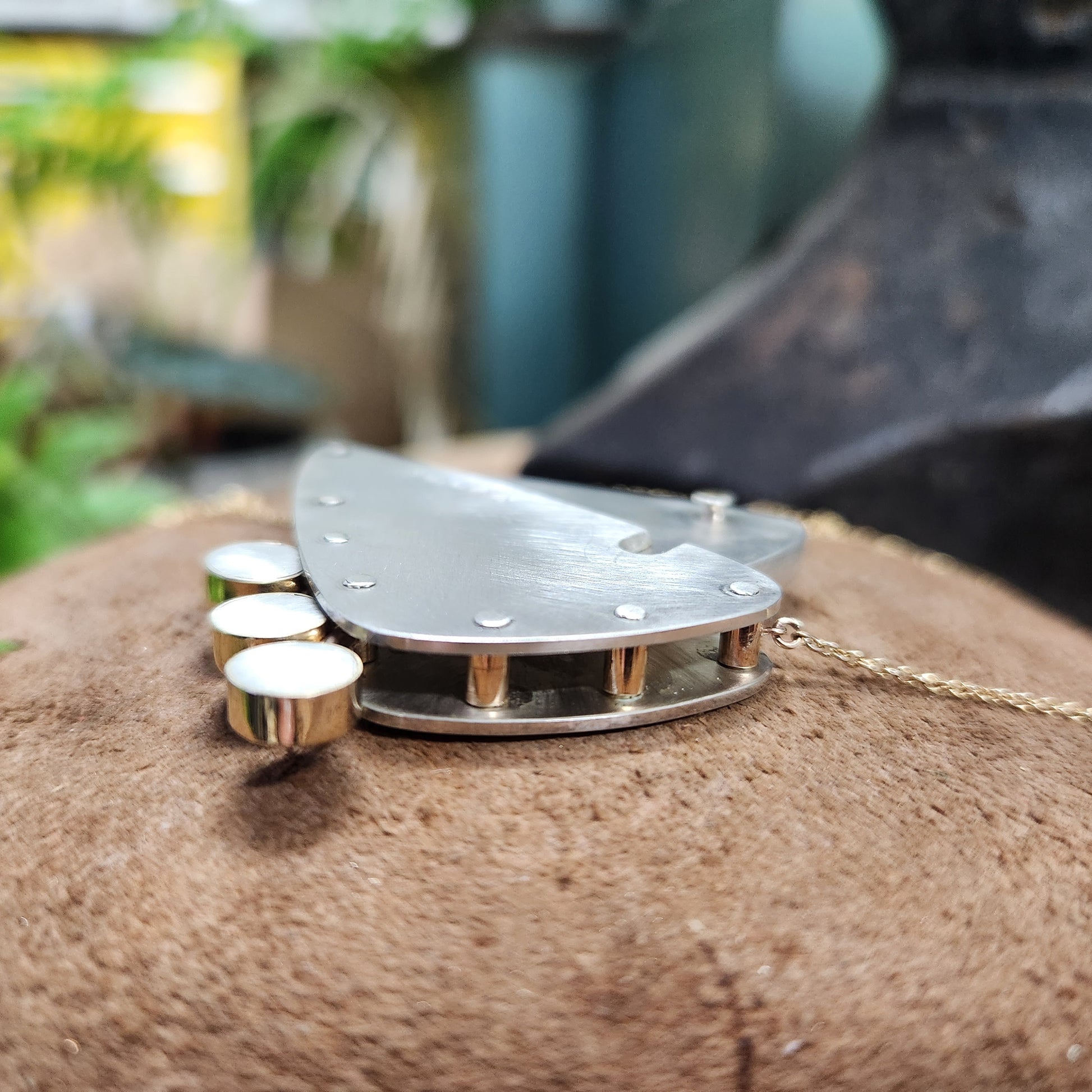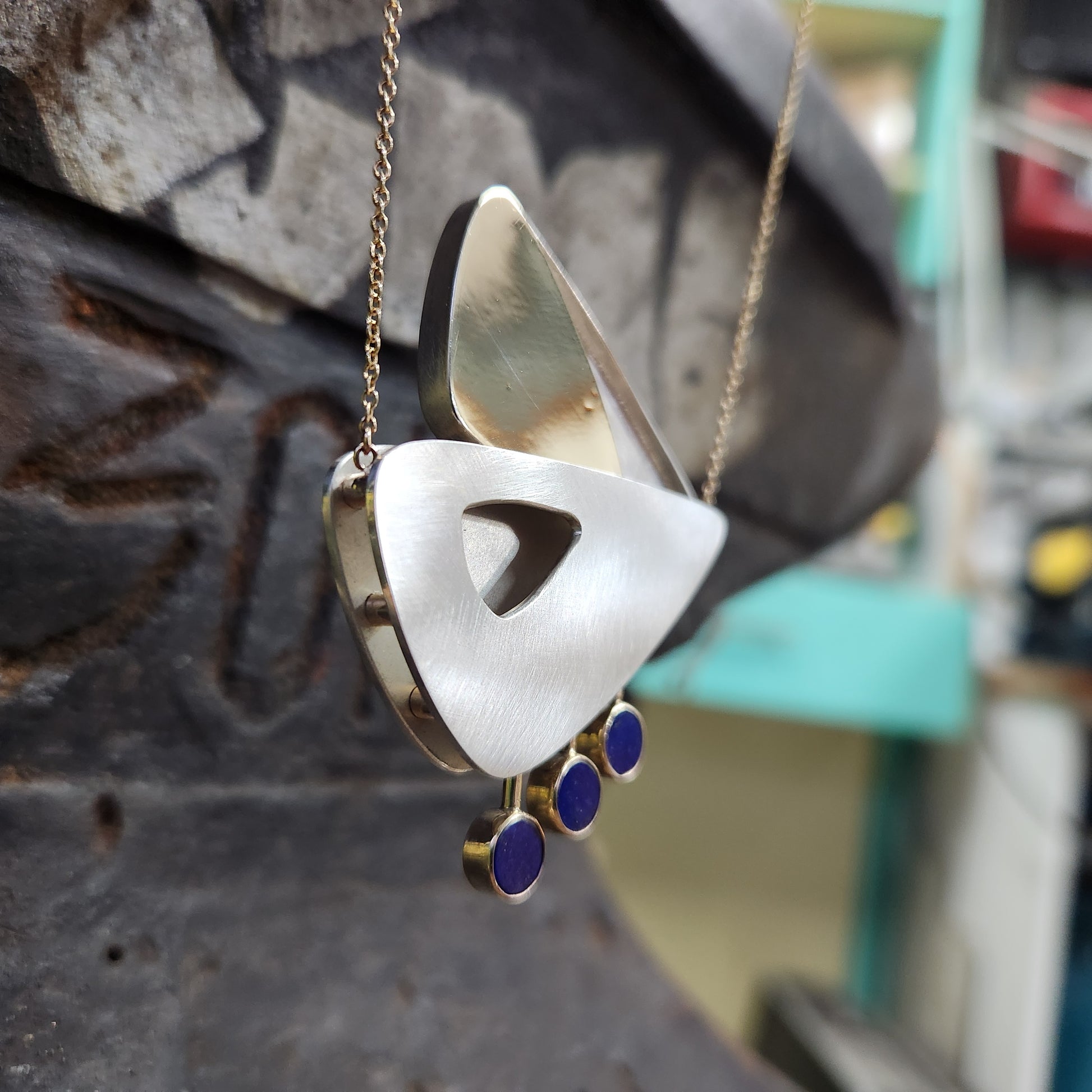 The Secrets Locket speaks to the relevance and impact of materials and their makers in a world beyond their initial purpose and practice. Jeweller Erin Pearce utilises a Modernist aesthetic to engineer a Sterling Silver, 9ct Yellow Gold & Lapis Lazuli horizontally hinged locket; a conveyor of the value and power of the female voice.