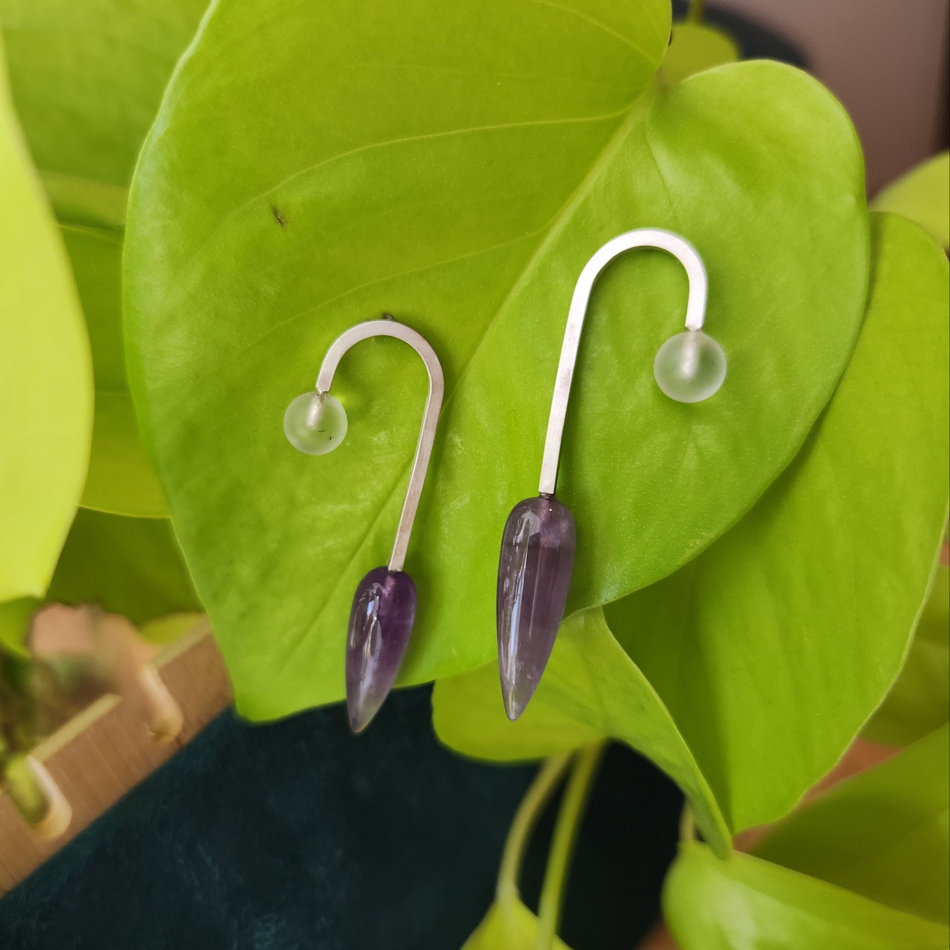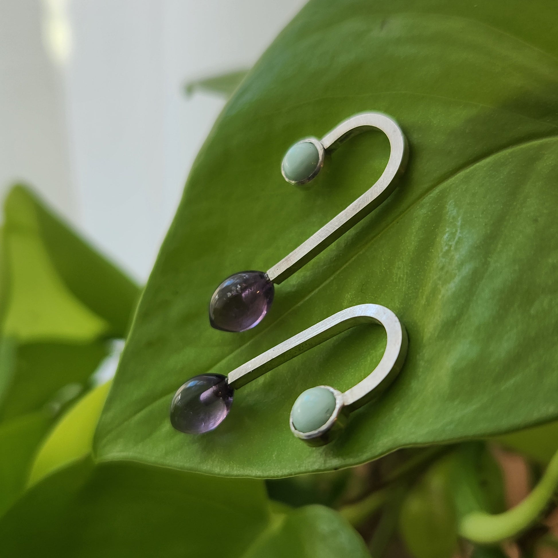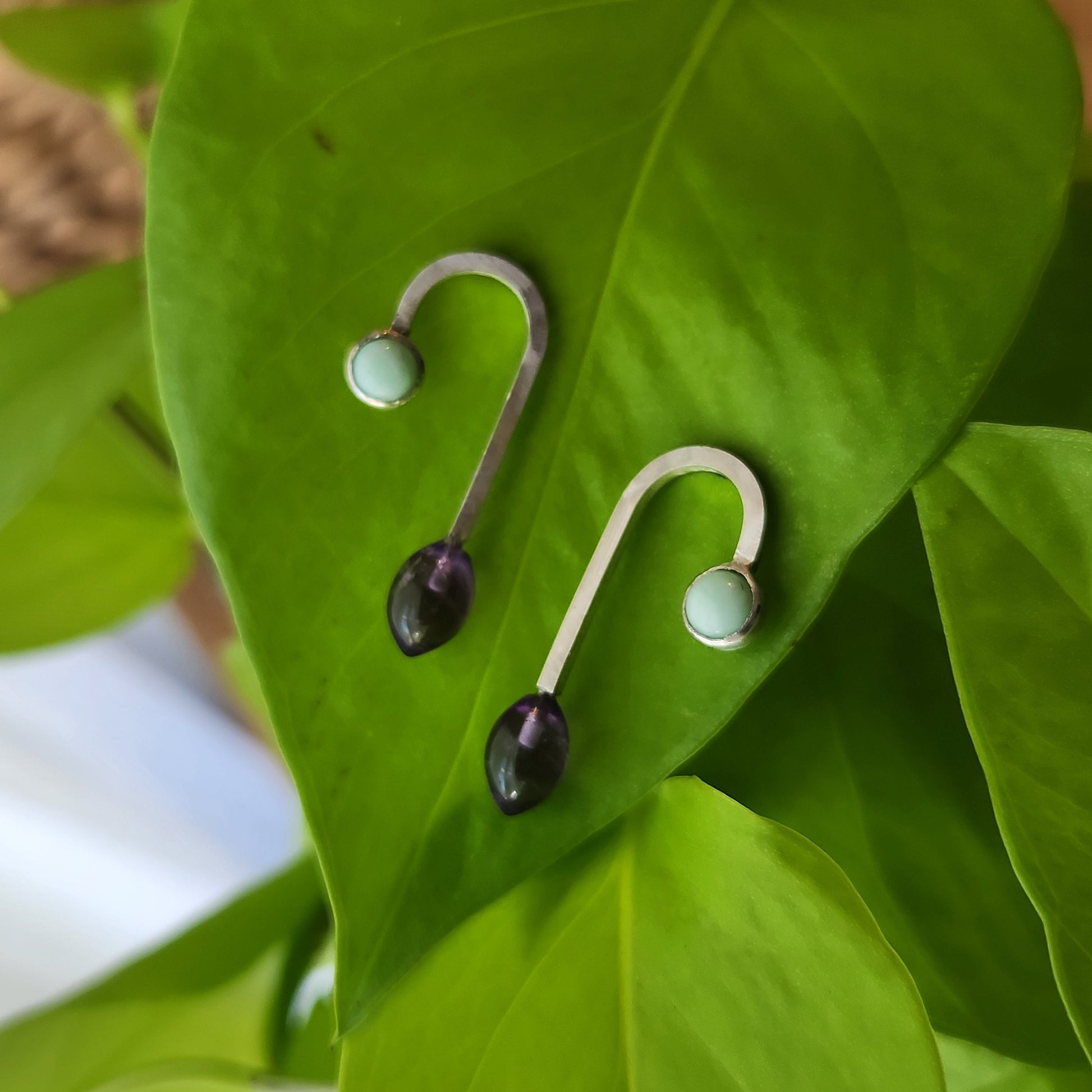 The Stanley pendant takes its name from the vistas of British Columbia, and its style from the mid century aesthetic that informs much of Mill Foundry's work. Featuring gemstones suspended from either end of a satin finished, curved square wire with a stud post and butterfly. These studs are beautifully balanced and ready to dress up any outfit.