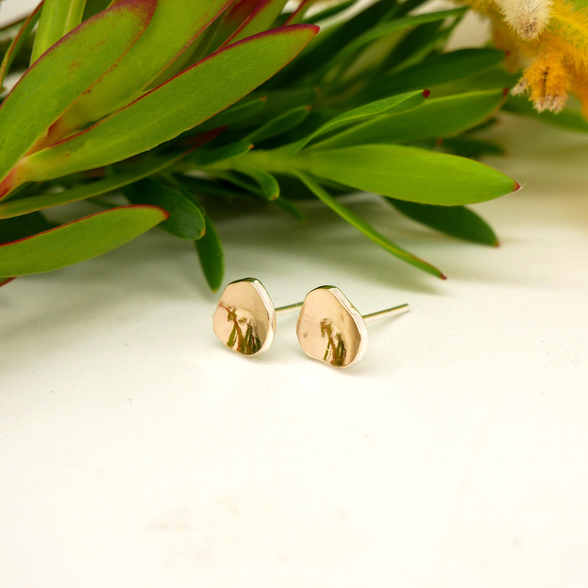 Highly polished, and completely unique, each stud has been hand cut so that no two pairs are alike. These studs are created from bonded Sterling Silver & 9ct Gold, under heat and pressure, at a ratio of 4:1, so that your gold surface is substantial and sturdy and will not wear away over time.